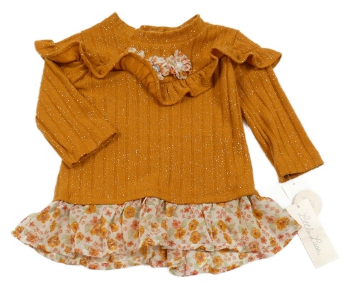 Nové - hořčicovo-smetanová třpytivá žebrovaná šatová úpletová tunika s květy a volánky Little Lass