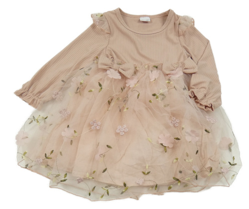 Pudrové žebrované šaty s tylem a květy a mašlemi a volánky