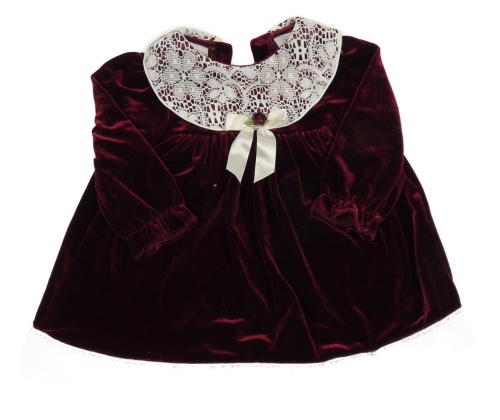 Tmavovínové sametové šaty s bílou krajkou a mašlí a límcem