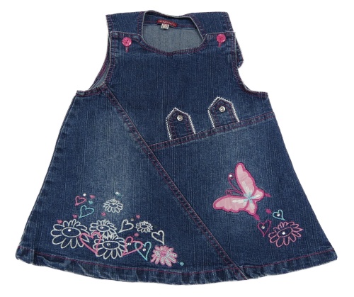 Modré riflové šaty s motýlkem a srdíčky a květy a kamínky