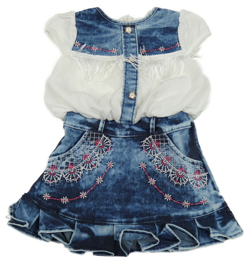 Modro-tmavomodro-bílé plísňové riflové šaty s květy a třásněmi a krnoflíky