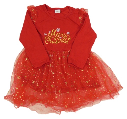 Červené vánoční šaty se zlatými nápisy a tylem s hvězdičkami a volánky