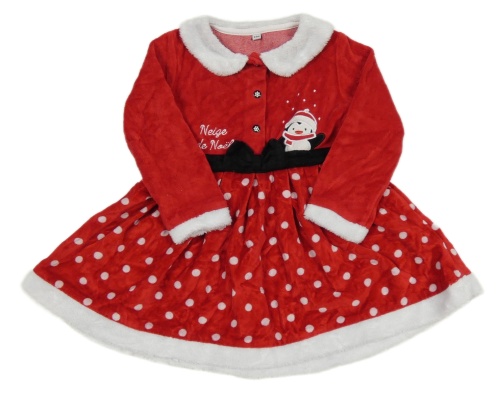 Červené sametové šaty s puntíkatou sukní a tučňákem