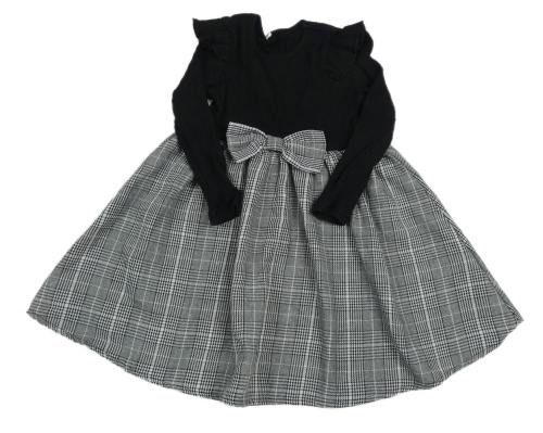Šedo-bílo-černé kostkované vzorované žebrované šaty s mašlí a volánky