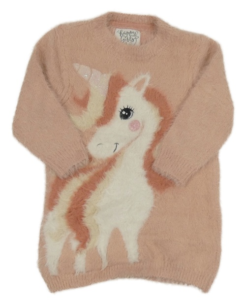 Světlerůžové pleteno/chlupaté šaty s jednorožcem C&A