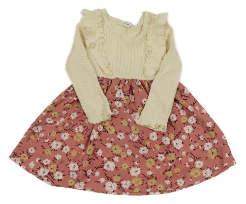 Smetanovo-růžové žebrované šaty s volánky a květovanou sukní
