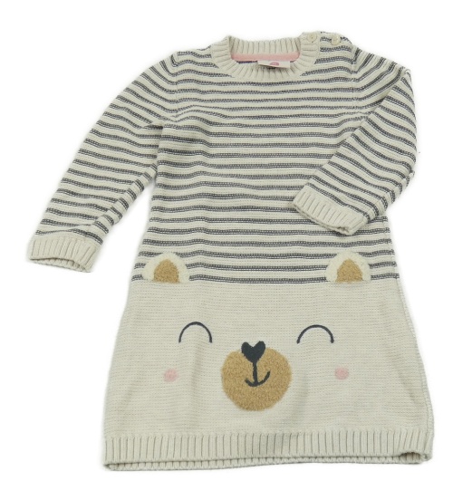 Světlebéžovo-tmavošedé pruhované svetrové šaty s medvědem Topomini
