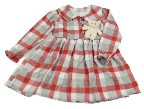 Šedo-červeno-bílé kostkované šaty s medvědem
