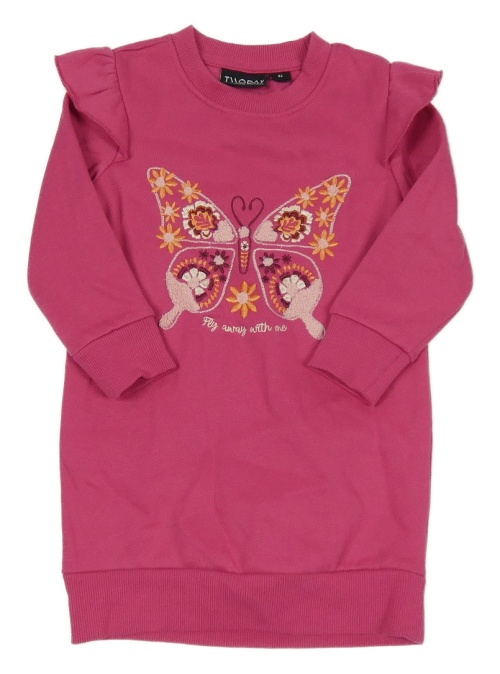 Fuchsiové teplákové šaty s motýlem z květin a volánky