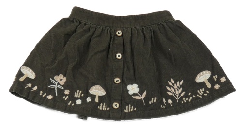 Tmavokhaki manšestrová sukně s houbami a květy Tu