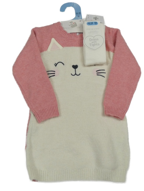 Nové - 2set - Růžovo-bílé svetrové šaty s kočkou + bílé punčocháče Primark