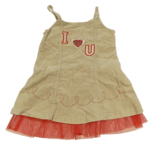 Béžové manšestrové šaty s nápisem a srdíčkem s flitry a korálky a tylovým volánkem