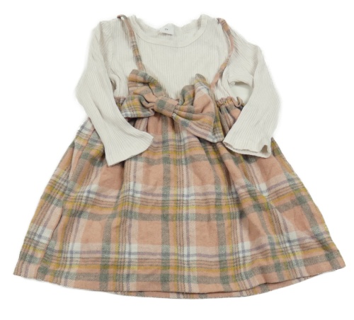 Starorůžovo-tmavošedo-okrovo-bílé kostkované žebrované teplé šaty s mašlí