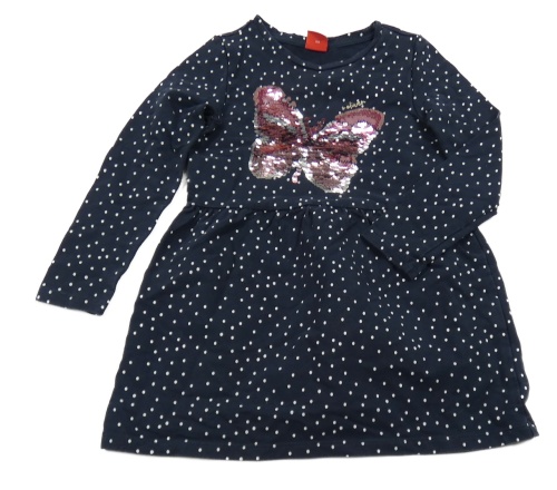 Tmavomodré puntíkované teplákové šaty s motýlkem z flitrů S. Oliver