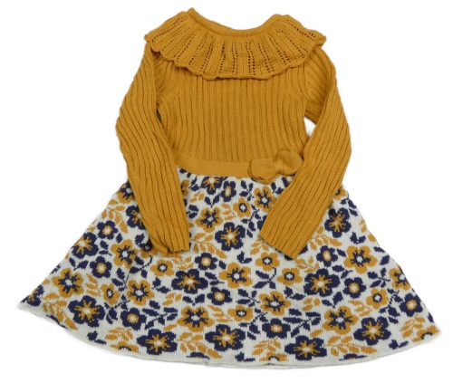 Hořčicovo-bílo-tmavomodré svetrové šaty s květovanou sukní a volánkem