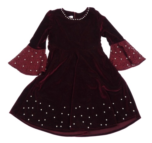 Tmavovínové sametové šaty s perlami a krajkovými rozšířenými rukávy BREEZE