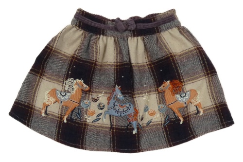 Fialovo-smetanová vlněná kostkovaná sukně s koníky