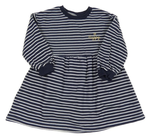 Tmavomodro-bílé pruhované bavlněné šaty se zlatým nápisem
