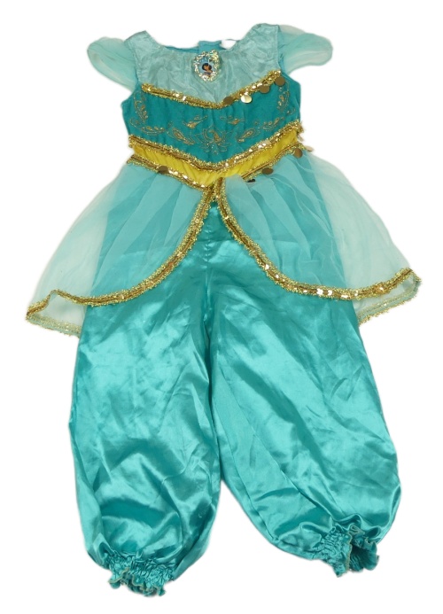 • Kostým - Tyrkysovo-jadeotovo-mátový saténovo/sametový kalhotový overal s pajetkami a broží - Jasmína Disney