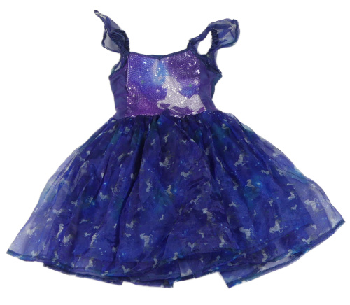 Kostým - Tmavomodro-fialové šaty s jednorožcem a flitry a tylem a organzou a volánky