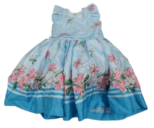 Světlemodro-modré šusťákové slavnostní šaty s kytičkami a volánky