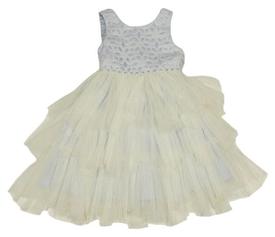 Světlemodro-smetanové slavnostní šaty s krajkovými květy