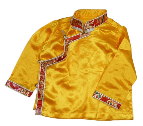 • Kostým - žluté saténové zavinovací triko s červeným lemem