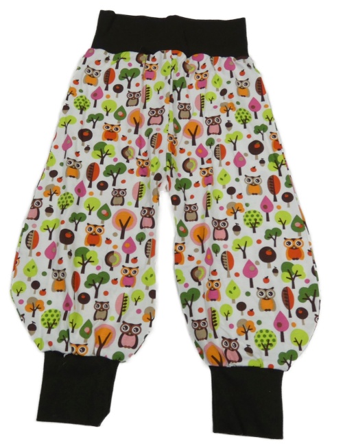 Bílo-hnědo-barevné tepláky se stromy a sovami