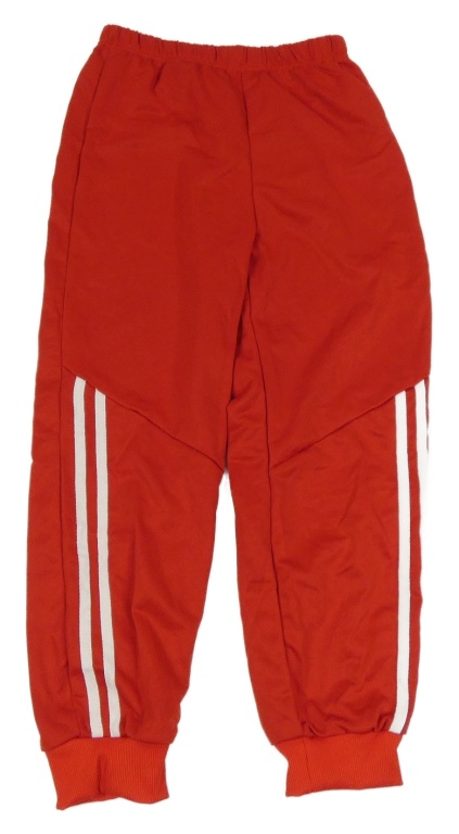 Červené sportovní tepláky s bílými pruhy