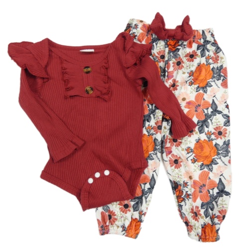 2Set - Bílé tepláky s kytičkami a mašlí + vínové žebrované body s volánky