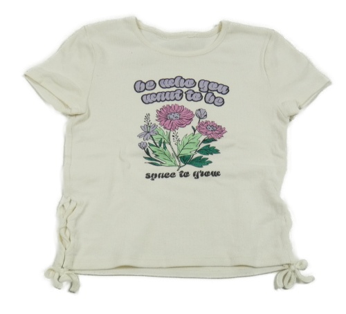 Smetanové žebrované tričko s kytičkami a nápisy a šněrováním