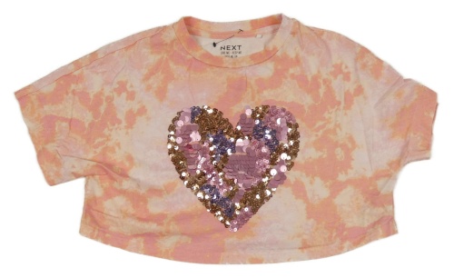 Korálovo-světlerůžovo-žluté batikované oversize crop tričko se srdíčkem z flitrů Next