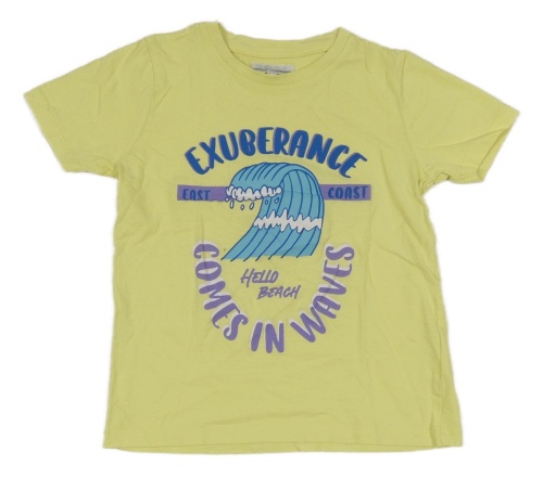 Žluté tričko s nápisy a vlnou