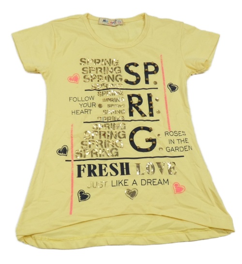 Žluté tričko s nápisy a kamínky