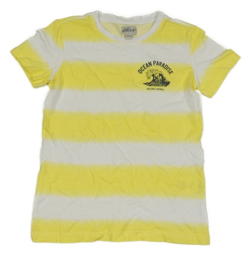 Žluto-bílé pruhované/batikované tričko s vlnou a nápisy alive