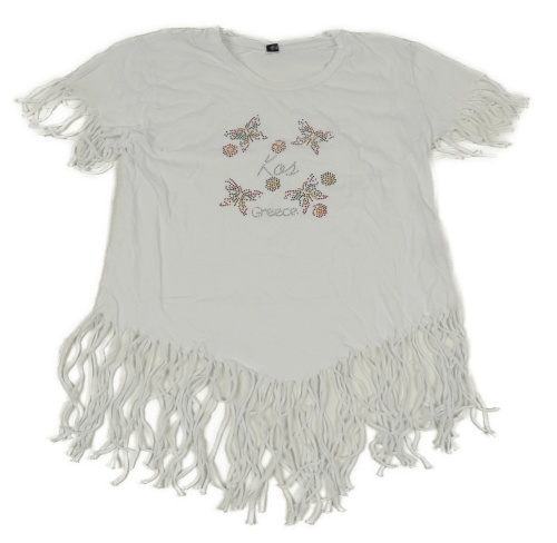 Bílé tričko s motýlky z kamínků a třásněmi