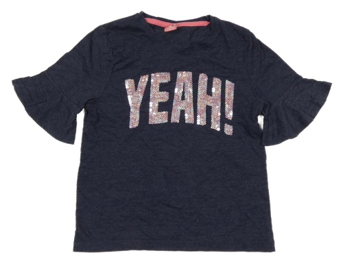 Tmavomodré melírované crop tričko s nápisem z flitrů a rozšířenými rukávy Y.F.K.