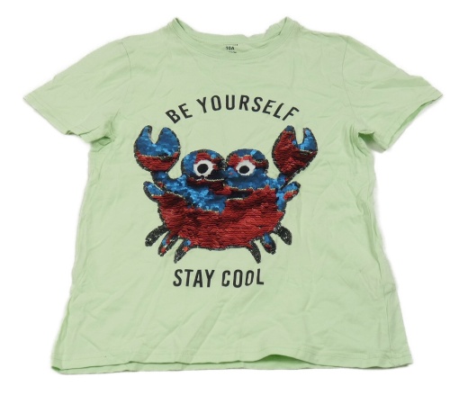 Světlezelené tričko s krabem z překlápěcích flitrů a nápisy KIABI
