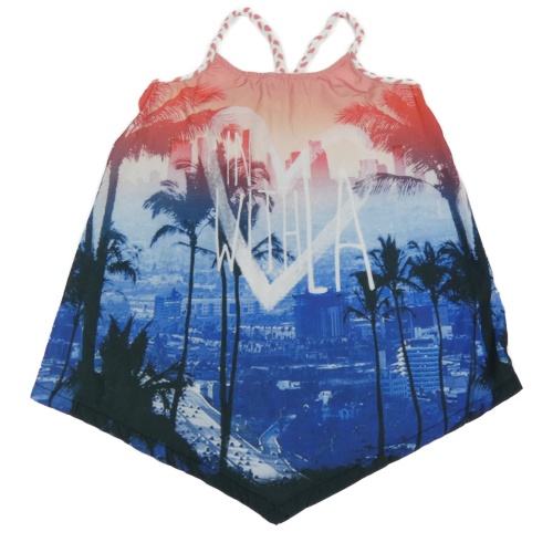 Růžogo-modrý asymetrický top s palmami a nápisem Yigga