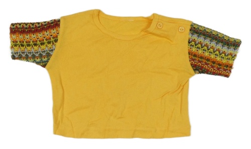 Oranžovožluté tričko s barevnými háčkovanými rukávy