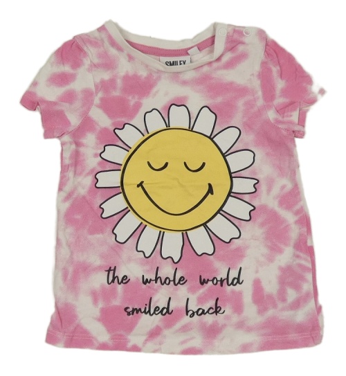 Růžovo-bílé batikované tričko s květinou a nápisem SMILEY WORLD
