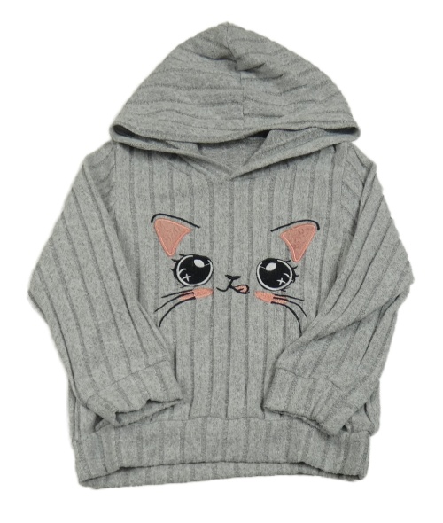 Šedé úpletové žebrované triko s kočkou a kapucí