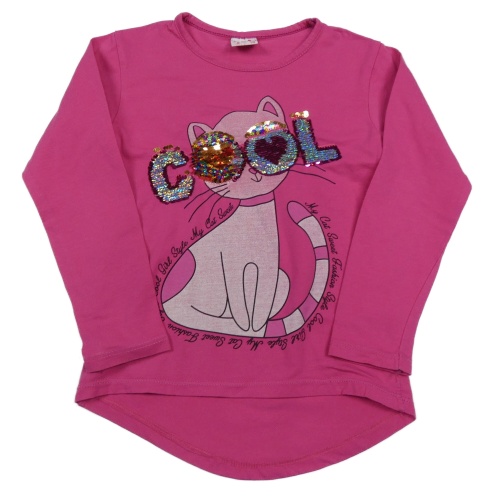 Fuchsiové triko s kočkou a nápisem z překlápěcích flitrů