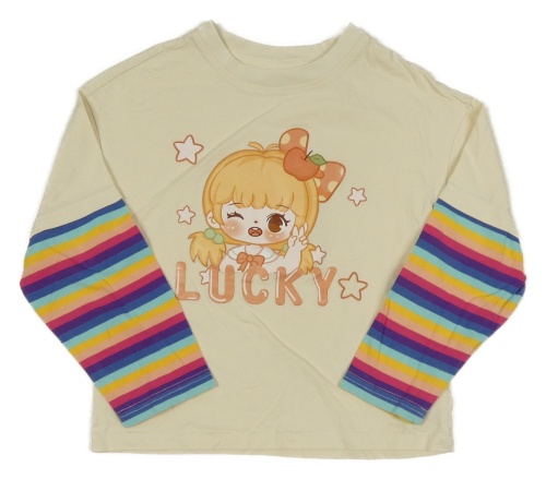 Světlebéžové triko s holčičkou a pruhovanými rukávy