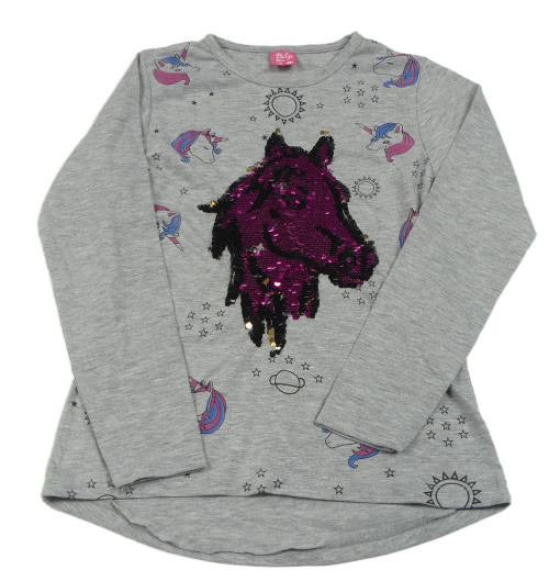 Šedé melírované triko s koníkem z překlápěcích flitrů a jednorožci