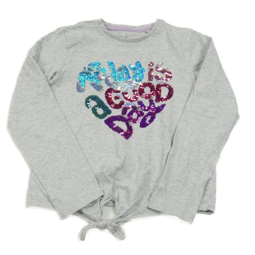 Šedé melírované triko s nápisy z flitrů a uzlem Nutmeg