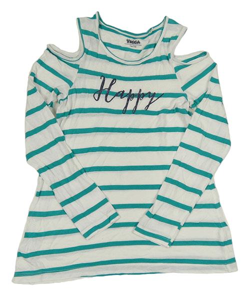 Bílo-jadeitové pruhované triko s nápisem a volnými rameny YIGGA