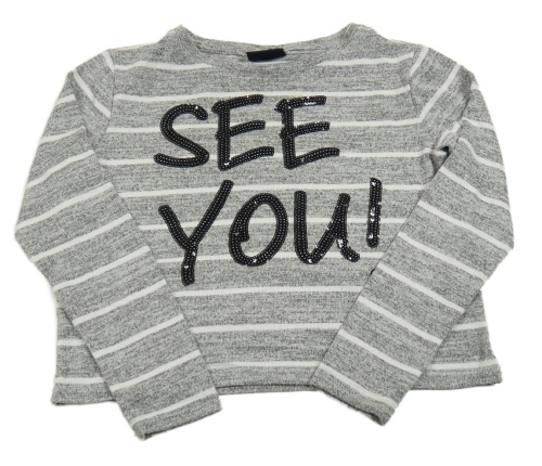 Šedo-bílé pruhované úpletové crop triko s nápisem z flitrů Page Young