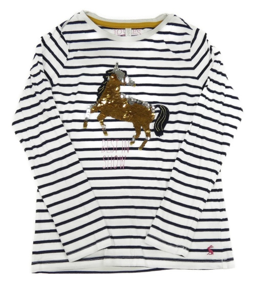 Bílo-tmavomodré pruhované triko s jednorožcem z flitrů Joules
