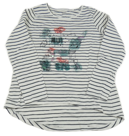 Bílo-tmavomodro-stříbrné pruhované triko s ptáčky a liškou a flitry YIGGA